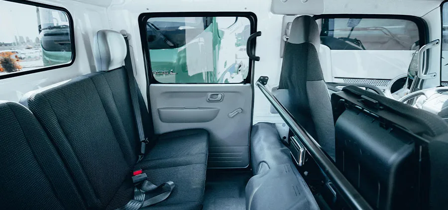 La doble cabina del Canter 615 DC 4x4 ofrece un diseño funcional y ergonómico, permitiendo transportar hasta 7 pasajeros con comodidad. Incorpora elementos pensados para la operación diaria, como volante regulable, asiento ajustable, aire acondicionado y radio con conectividad Bluetooth, entregando confort incluso en jornadas prolongadas de trabajo. Concepto ergonométrico en interior de la cabina con certificación ECE R29 de la Unión europea.